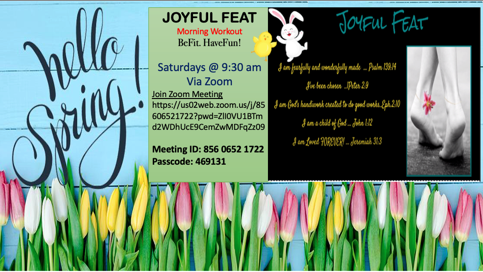 Joyful Feat is for anyone who seeks some burst of energy on Saturday mornings. It is a 30 to 45 minute low impact workout session via ZOOM that is open to everyone.